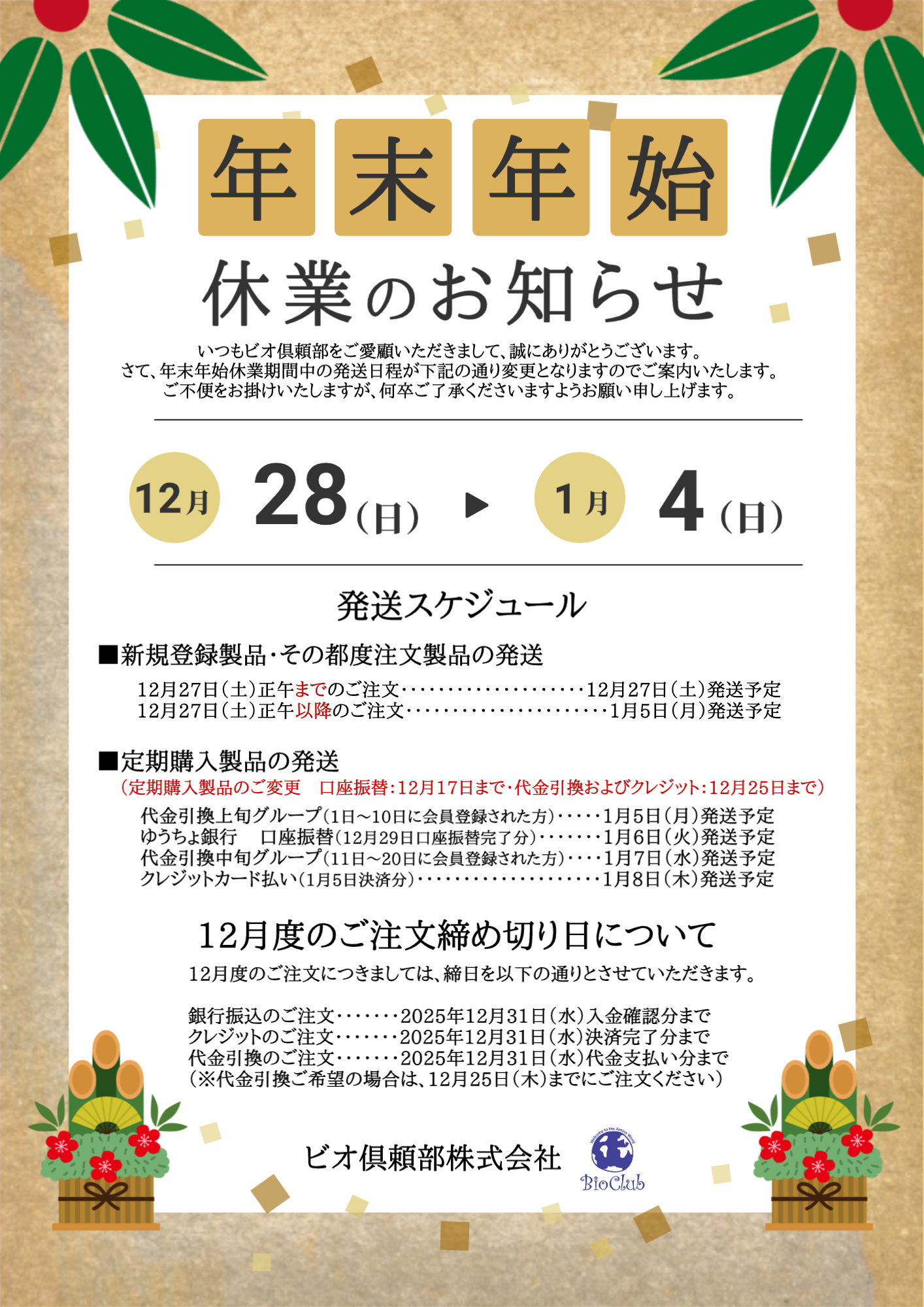 年末年始休業日と発送スケジュールのお知らせ