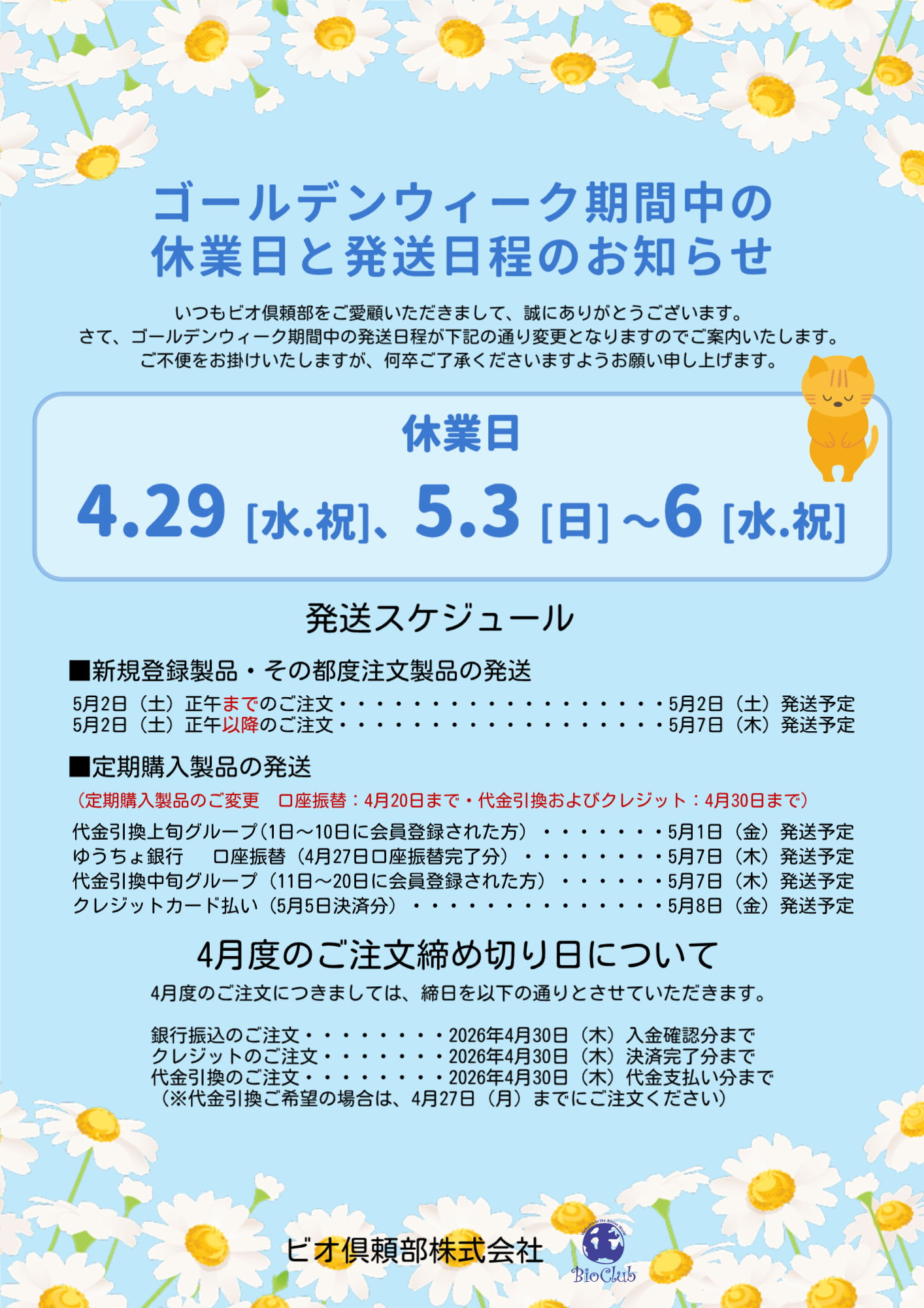 ゴールデンウイーク期間中の発送日程のお知らせ